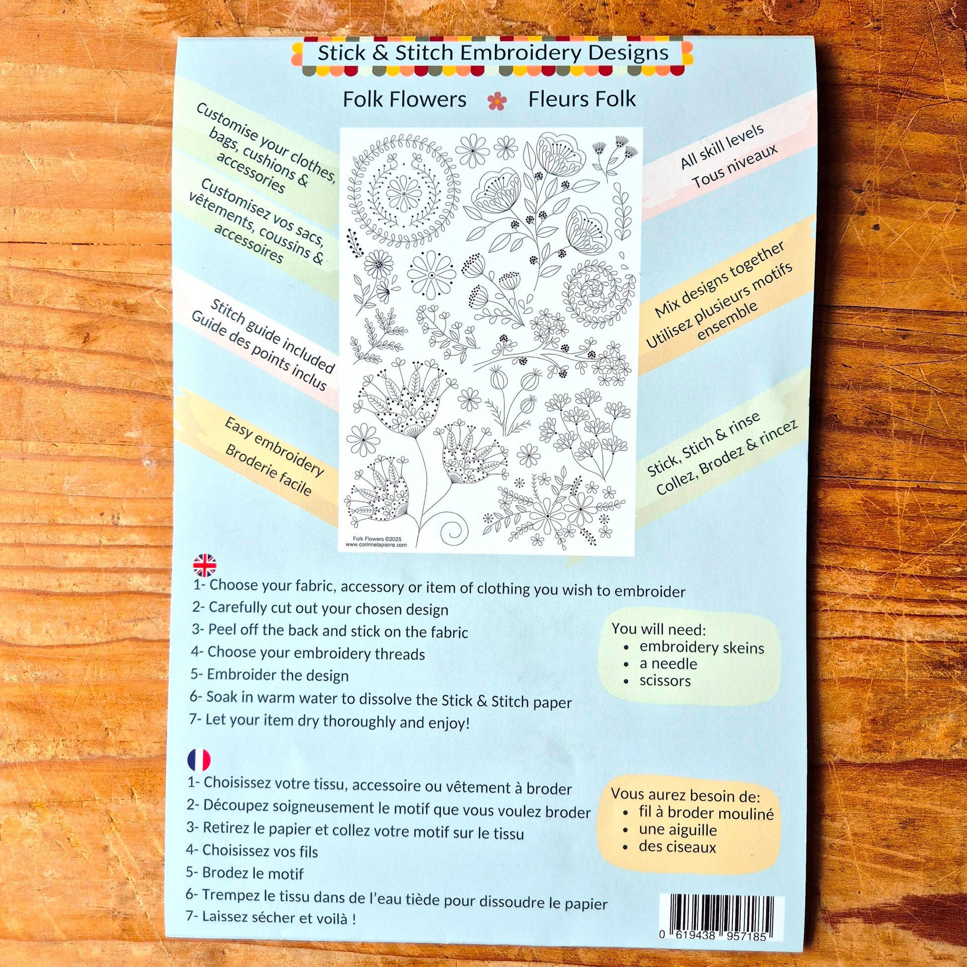 Simply cut out the design, peel off the backing, stick onto the fabric or clothing and embroider. Once completed, the pattern can be rinsed away in warm water leaving just a beautiful embroidered creation.